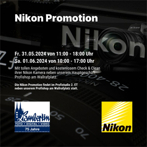 Nikon Promotion und 75 Jahre Foto Lambertin mit tollen Angeboten und kostenlosem Check & Clean ihrer Nikon Kamera im Profistudio 2. ET neben unserem Profishop am Wallrafplatz.